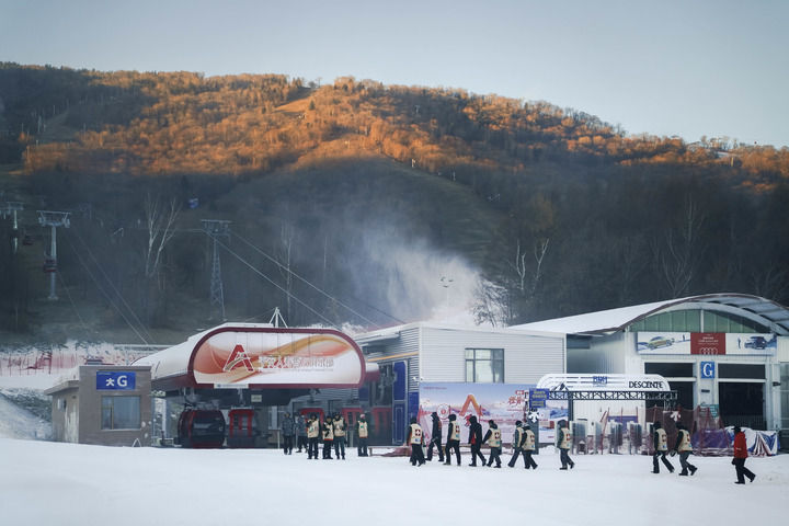 在位于吉林市冰雪经济高质量发展试验区的北大湖滑雪度假区,工作人员集结准备进行雪道巡检。 新华社记者 许畅 摄