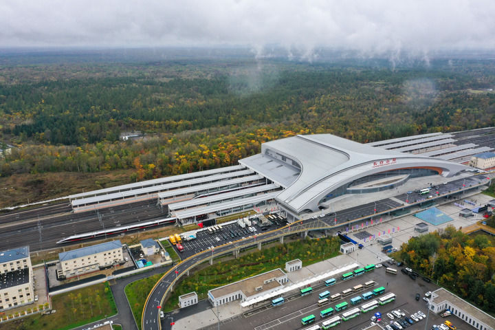 从长白山站开往沈阳北站的G8166次列车驶出长白山站(无人机照片)。 新华社记者 张楠 摄
